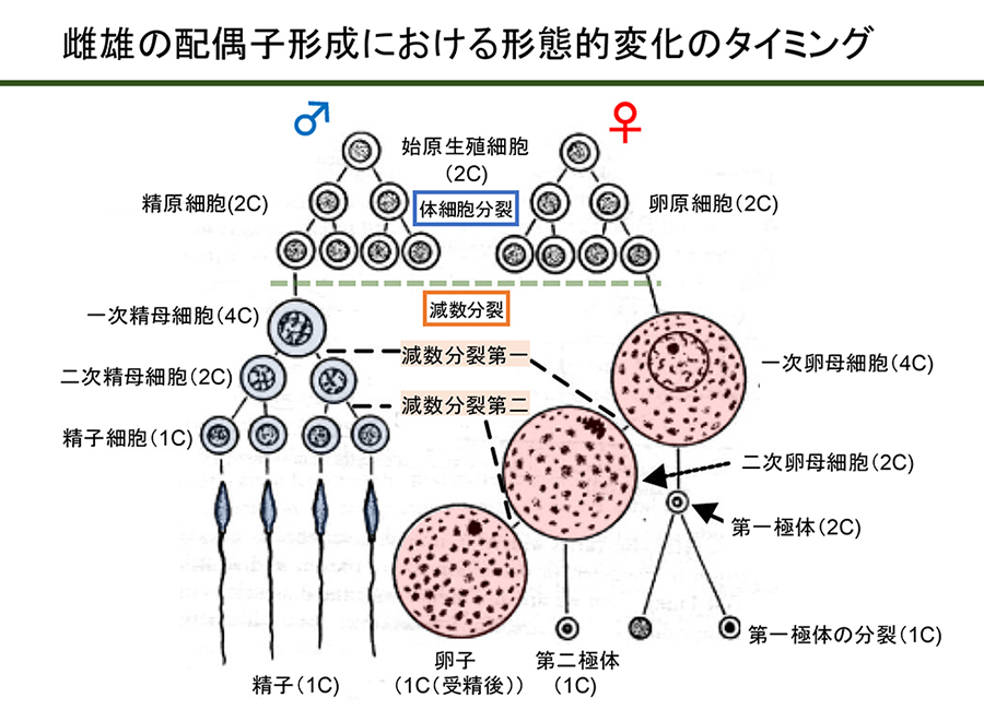 「卵子や精子が作られる時にそれぞれ細胞分裂を行います。ここで卵子になる卵母細胞は急に大きくなります。そして卵子と精子は大きさも形も大きく違ってきます」