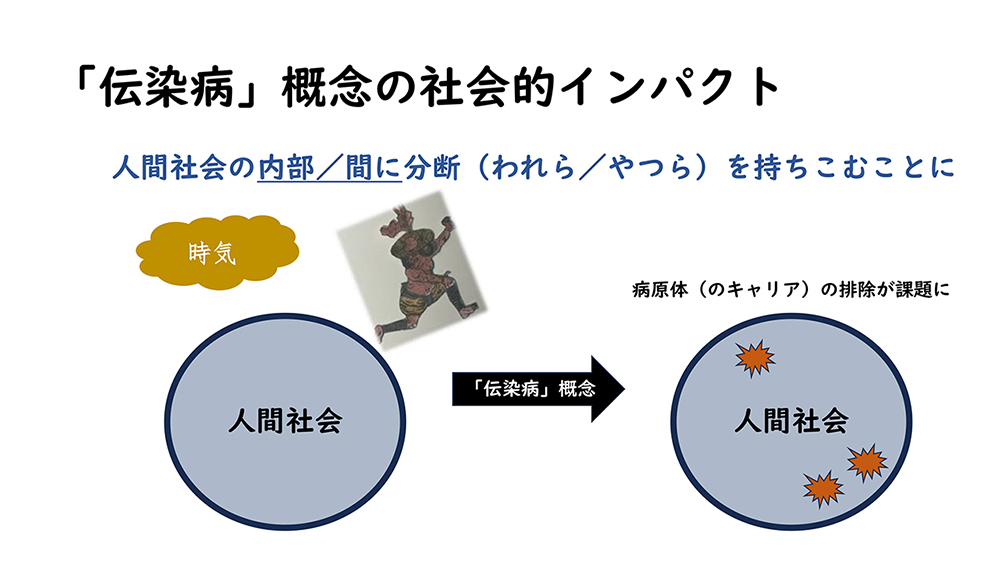 明治時代になると伝染病の概念が導入され、外ではなく、社会の中で人や動物にいる病原体を根絶することが社会課題になりました。これは伝染病対策を進化させる一方で、人間社会に分断をもたらすことにもつながりました」