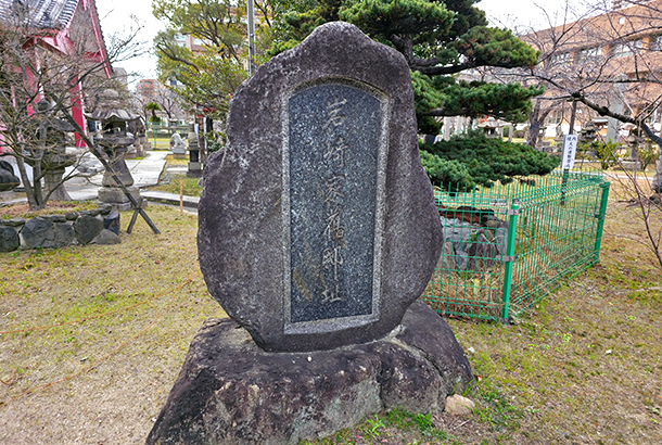 土佐稲荷の境内には、隣接地に建てられていた岩崎彌太郎の屋敷があったことを示す「岩崎家舊邸(きゅうてい)址」(岩崎家旧邸跡)の石碑が移設されています。