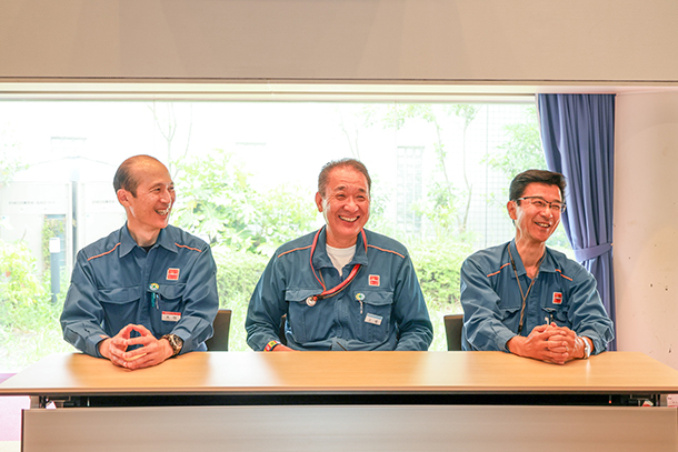 ![]() 根岸製油所の歴史を知る(左から)大竹 淳さん、三宅 龍志さん、及川 次郎さん