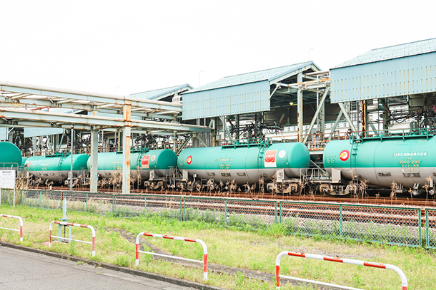 ![]() 鉄道輸送を担うタンク車。敷地内の専用線路から長野県や群馬県などへエネルギーを届ける