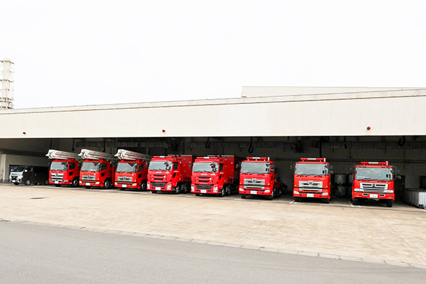 ![]() タンク群の間近に控える自衛消防隊の車両。長さ27mまで伸びるブームは、カメラで状態を確認しながら消火活動ができる