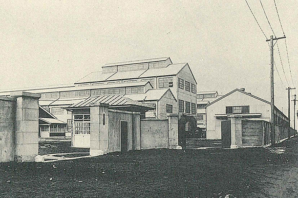 創業当時の本社工場。隣接する運河の向こうは横浜市という好立地。鶴見臨港鉄道(現・JR鶴見線)も開通していた