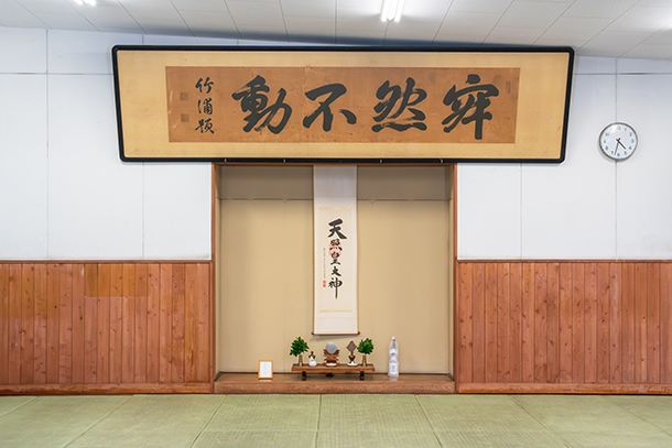 現本社の武道場。青年学校のために岩崎小彌太が揮毫(きごう)した「寂然不動(じゃくねんふどう)」の扁額が遺る。無心無為、じっと動かなければ天の動きを感じられるという意味
