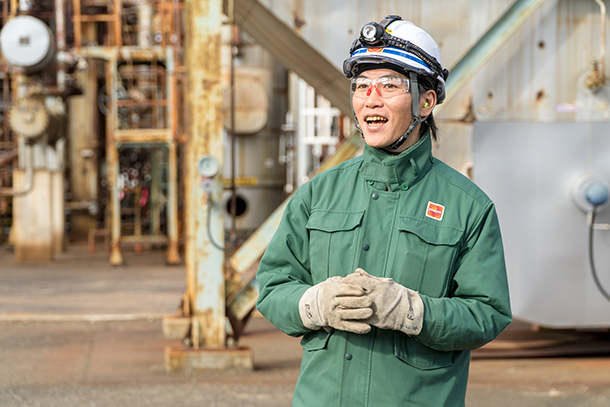 同製油所の有馬広大さん。オペレーターとして日々の運転管理や点検業務を担っている