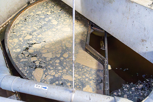 「まず各所から流入した雑排水からごみを取り除き、流量を調整しながら土壌菌を含んだ泥と混ぜて有機物を分解します。それから沈殿槽へ流れていきます。汚泥と上澄みに分離しているのが見えますか。この工程を2回繰り返してから砂のフィルターでろ過し、塩素系の薬剤で殺菌しているんです」。