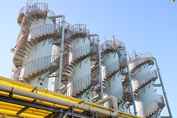 大規模な設備が並ぶ製油所の中でも見上げるほどの大きさ。石油の精製に欠かせない大量の水素を製造する装置です。