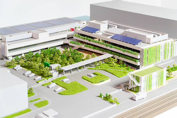 新本社の完成模型。中央には「共創の森」と呼ぶ緑地を配置して憩いの空間に